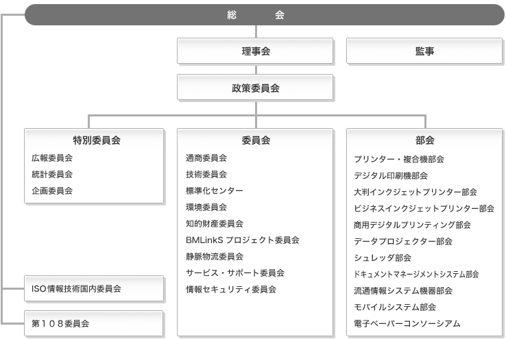 本会の業務は理事会の決定を経て執行され、運営に関する基本事項を審議するために政策委員会が設置されています。 また、会員各社からの参加者をもって、委員会と部会が設けられ、JBMIA の設立目的を達成するために、日々、活動を行っています。